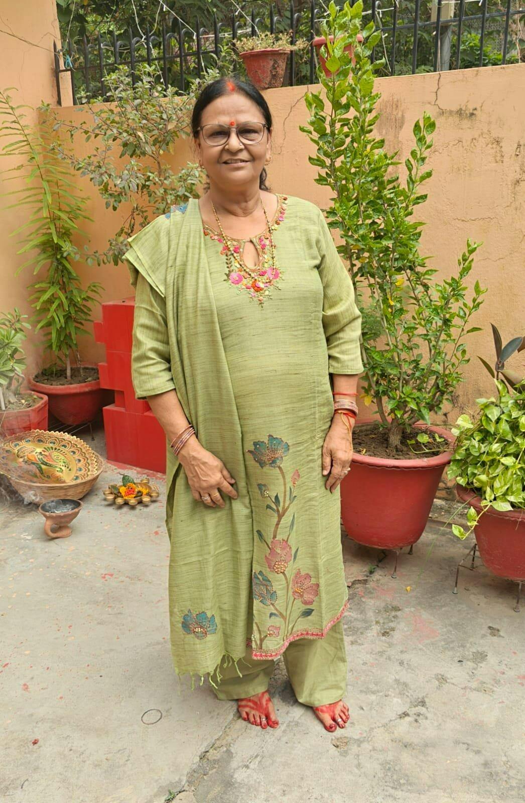 Celebrate artisanal craftsmanship with this linen hand painted and hand embroidered suit set from Saantha. The kurta features intricate hand embroidery around the neckline, while the dupatta and hemline are adorned with hand-painted lotus motifs enhanced with embroidery detailing. Crafted in breathable linen, this ensemble combines natural comfort with an artistic appeal. Paired with straight pants, it is perfect for festive gatherings, cultural events, or occasions where you want a statement handcrafted look.